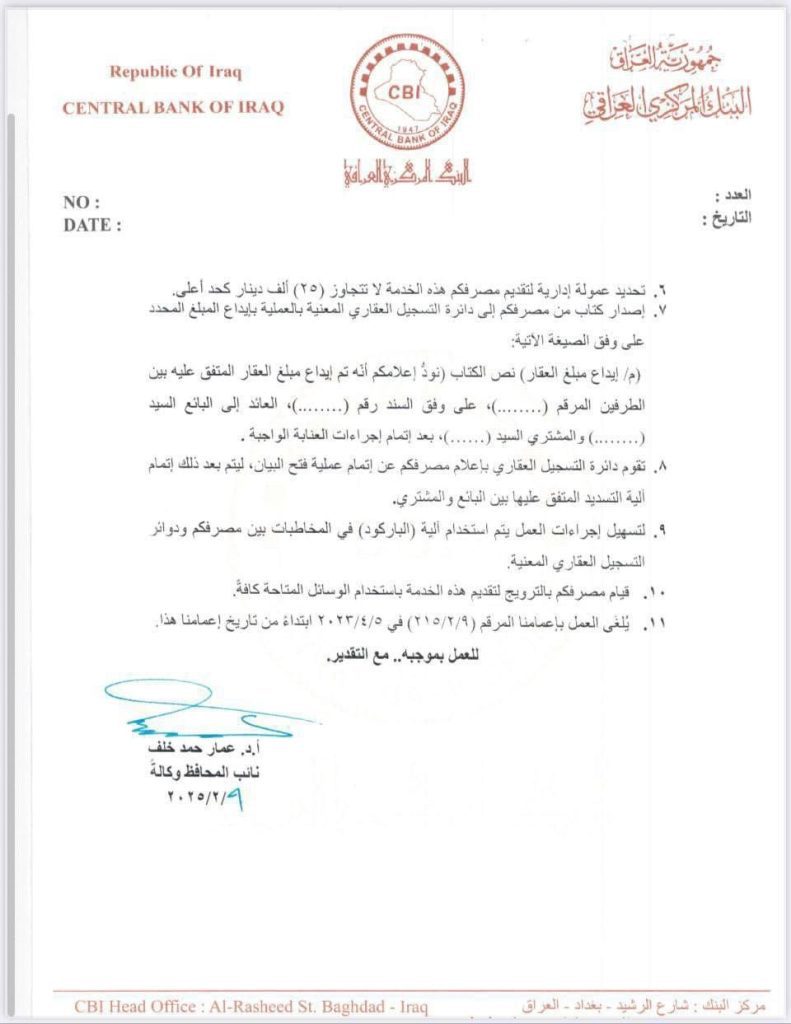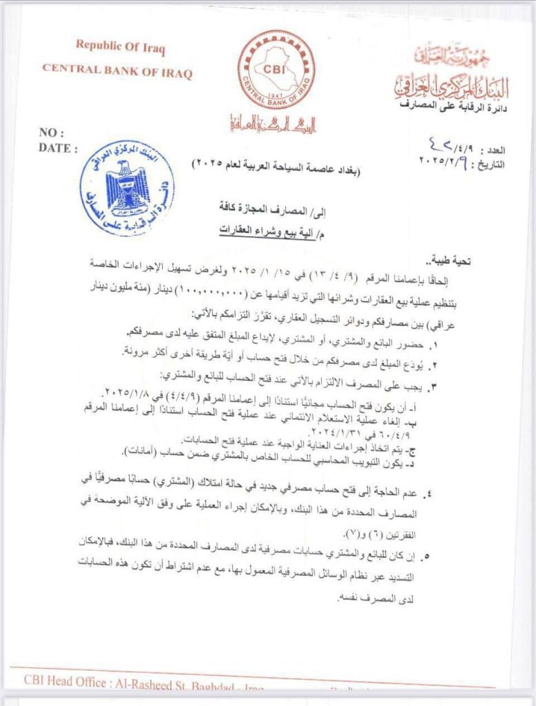 وبموجب التعليمات الجديدة، وفق كتاب رسمي موجه إلى دائرة التسجيل العقاري، فإن بيع هذه العقارات سيتم فقط عبر المصارف العراقية المجازة، وأن هذا الإجراء يأتي ضمن ضوابط العناية الواجبة بمكافحة غسيل الاموال وتمويل الارهاب الخاصة بدوائر تسجيل العقاري.