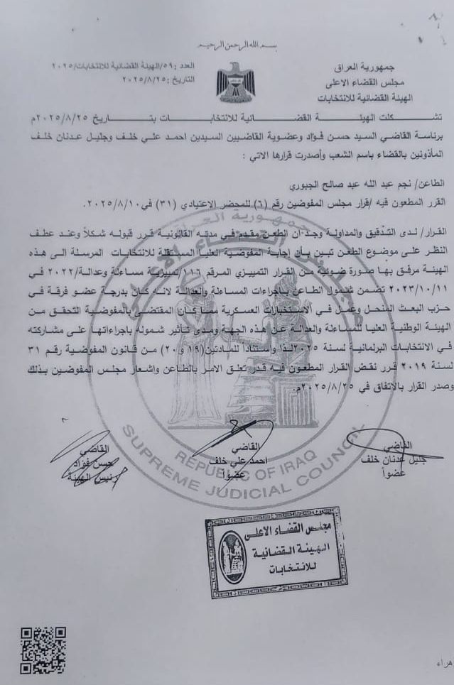جاء ذلك استنادا لقرار الحكم الصادر بتاريخ 25 من شهر آب/أغسطس الجاري، والمذيل بتوقيع رئيس الهيئة القضائية للانتخابات القاضي حسن فؤاد، ونائبيه.